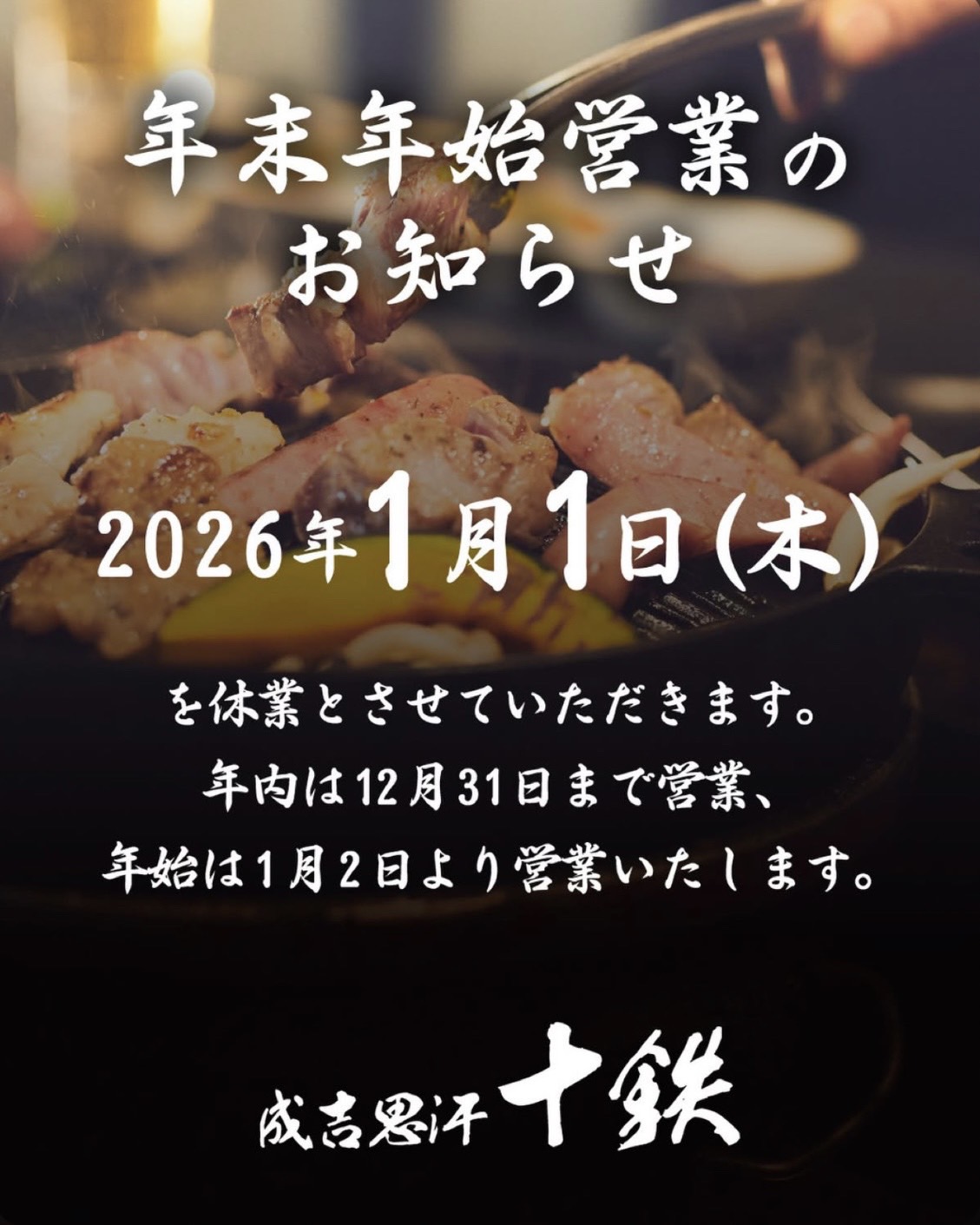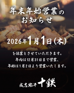 「十鉄」は、2026年1月1日(木)を休業とさせていただきます。 年内は12月31日まで営業、年始は1月2日より営業いたします。 今後ともスタッフ一同、十鉄をよろしくお願いいたします。